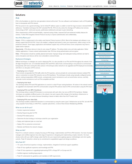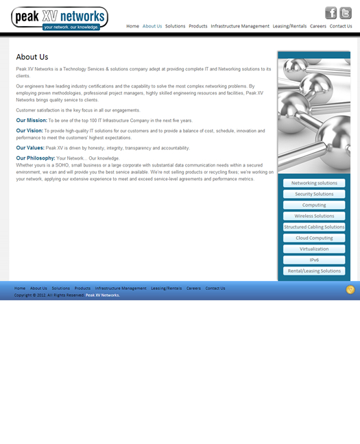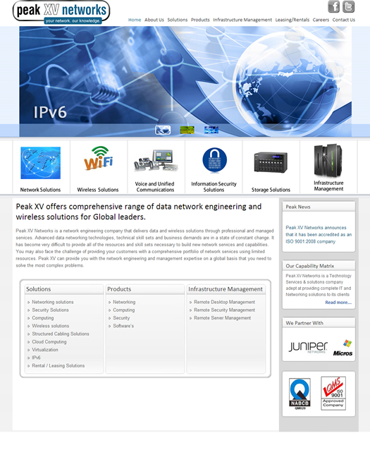 Peak XV Networks is a network engineering company that delivers data and wireless solutions through professional and managed services. Advanced data networking technologies, technical skill sets and business demands are in a state of constant change. It has become very difficult to provide all of the resources and skill sets necessary to build new network services and capabilities.